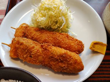 「ヒレ串カツ定食」 こちらはお嫁さんがご注文した「ヒレ串カツ定食」です。 お嫁さんは今まで食したことがないメニューをバンバンご注文していきますよ。 なので毎回ご来店の際にHPを更新している感じがしますね。 メインのお皿を見てみますと、大振りな串カツが2本鎮座しています。 そういえば以前ランチメニューで串カツとアジフライがセットになったのがあったけど、あの時の串カツと同じなのかな!? 写真を見比べてみたけど、外観だけだと分かりませんね^^; 今日は少しお嫁さんに串カツを分けてもらいましたが、中身はヒレ肉とタマネギが交互に串に刺さっており、カリッと揚げられています。 お嫁さんは醤油とソースとステーキソースなど色々な調味料を試していましたが、結構ステーキソースは合うのでは!?と思っておりました。 |