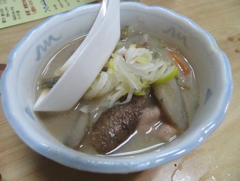 「モツ煮込み」 これも定番のメニューの一つです。 モツはコリコリしており、非常にまいう〜です。 何かモツ自体の味が濃いような気がします。 でもここまでで大生を3杯位いっているので、そろそろ記憶が曖昧になり始めています。 |