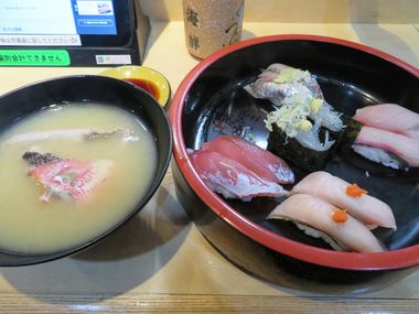 お店の場所は京浜急行電鉄の三浦海岸駅から徒歩で5分少々のところ。 これだけ流行っているお店だから、さぞや大きな店なんだろうと想像するのですが、意外にこじんまりとしています。 奥行きは少し広めなものの、間口は普通のラーメン屋ほどしかありません。 席はカウンター席は20人分位、テーブル席が4人×5台位でしょうか。 現在は新型コロナが騒がれていますが、 対策はバッチリです。 先日換気扇を新調したようで12分で店内の空気が循環するような仕組みの換気扇を導入したそうです。 またカウンター席は2人づつ敷居で区切られていて、調理場と客席の間にも敷居があります。 これなら飛沫防止もバッチリですね。 メニューのほうですが、すごく豊富です。 例えば普通の回転寿司だと、マグロは大トロ、中トロ、赤身、ネギトロってのが多いと思いますが、ここのは更にカマトロ握り、ほほ肉握り、炙りマグロ、更にマグロも本マグロやビンチョウなども選べる充実ぶり。 更に地魚のメニューも20種類以上はあったと思いますよ。 またセットメニューも充実しています。 ちなみにセットメニューにはもれなくワカメタプ〜リの味噌汁がついてきます。 これだけついてお値段が結構安い! 特上寿司でも1250円位。 地魚セットは1050円、これはたまらんですね!! |