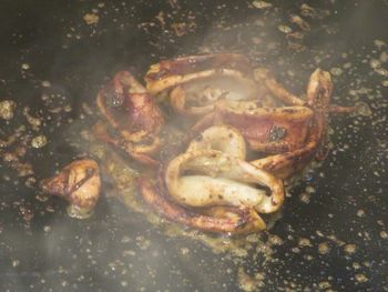 なんでも7割くらいイカが焼けたところでもやしを入れると丁度良い塩梅になるそうです。 ちなみにさっきのイカの丸焼きは生の肝を一緒に焼くのですが、こちらのゲソ焼きは肝のタレのようなものを入れて焼いていました。