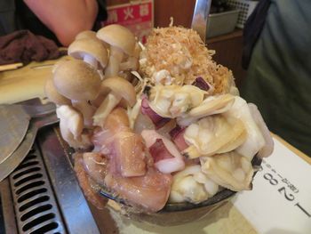 「ミックスお好み焼き」 前回ご来店の際はご注文しなかったのですが、こちらのお店は種類はそんなに多くはないですが、お好み焼きも提供しているんです。 種類はベーシックなものに加え、海鮮が入ったもの、牛すじが入ったものなどありますが、 今回はそれらが全部入った「ミックス」をご注文しました。 もんじゃ焼きは、目の前の鉄板で店員さんが焼いてくれますが、お好み焼きは隣の席の鉄板で、店員さんが焼いてくれたものを更に乗せて席まで持ってきてくれます。 鉄板の丸皿に乗せて持ってきてくれるので、冷めないように、 鉄板の皿ごと、目の前の鉄板に乗せて頂くことができます。 こちらのお好み焼きはちょっと変わっておりまして、大阪風のお好み焼きと広島風のお好み焼きを足して2で割ったような感じ。 お好み焼きの中には焼きそばの麺も入っていたんですよ。 そして上部には綺麗に目玉焼きも添えられています。 ソースはソースとマヨネーズを混ぜたような味のするまいう〜ソースでした。 きおのお好み焼きに青のりをタプ〜リ乗せて頂きます〜。 なんと、こちらのお店、もんじゃ焼きも超まいう〜ですが、お好み焼きも超まいう〜! しかも先ほど言ったように、大阪風と広島風のいいとこ取りしているような感じなので、個人的には相当にまいう〜なお好み焼きでありました。 |