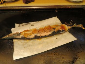 鉄板の上に紙のようなものを敷き、その上でサンマを焼いていました。 皮が剥がれないようにしているのかと思ったけど、途中でひっくり返したらちゃんと皮が剥がれてたね^^; 片面6分、両面12分で焼き上がりました。 久々の秋刀魚の塩焼き、美味かったな〜。 |