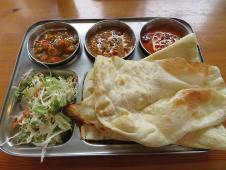 以前はナンと2種類のカレーとサラダがセットになったメニューがありましたが、今回見たメニュー表では、カレー1種類+ナン+サラダのセットか、または3種類のカレー+ナン+サラダのセットがメインになっていました。