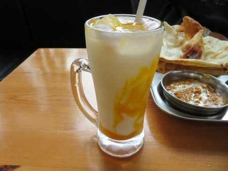 | こちらはお嫁さんがご注文したマンゴラッシーです。 これまいう〜なんですよね〜。 普通のラッシーもまいう〜ですが、やっぱりマンゴラッシーが好きですね。 管理人は最近ことさらに甘いものを飲まなくなってきているので、今日は水にしておきましたが、なんだか少し羨ましい・・・^^; 次回はマンゴラッシー飲んでみようかと思いました。 |