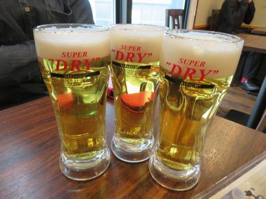 「ビールで乾杯〜」 まずは料理をご注文する前に、生ビールをご注文しました。 こちらの生ビールは600円でしたので、まぁ最近の普通の価格設定ですね。 ビールジョッキサイズもよくある普通の中ジョッキです。 ではでは乾杯〜。 いや〜やっぱり11時から飲むビールは最高ですね〜。 今日は我々は11:00〜13:25頃までいましたが、お酒を呑んでいるのは我々だけでしたね。 お客さんのほとんどが御一人様で食事をしにきたって感じでしたからね。 今日も飲みすぎ注意で、ペースは落としていたのですが、結局生ビール5杯飲んじゃいました。 |