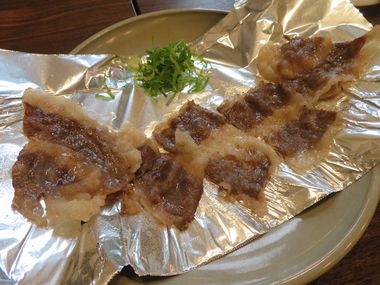 「コウネ」 最初にお好み焼きと鉄板焼きのメニューをご注文しましたが、最初に鉄板焼きの部門のメニューが参りました。 多分ビールを頼んだから、おつまみになり、かつ提供が早そうなメニューを先に持ってきてくれたんですね。 こちらは「コウネ」と言いまして、広島県でよく食べられている肉だそうです。 広島県では焼肉屋さんだけではなく、居酒屋やスポーツ観戦の会場でも頂けるほど、広島県民にとっては身近な食べ物なんだそうです。 コウネというのは牛肉の肩バラ肉のことで、広島県以外では「ブリスケ」や「前バラ」、「肩バラ」とも呼ばれるようです。 肉は薄目にカットされており、肉と脂の比率は7:3位で管理人好み。 味付けは醤油ベースの少し甘めでした。 美味いは美味かったのですが、もう少し厚めにカットしてくれたらもっとまいう〜だったのではないかな〜と思います。 |