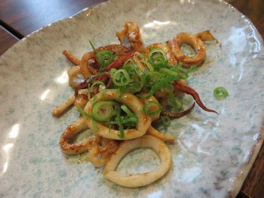 「イカ焼き」 こちらも鉄板焼きのメニューからご注文した「イカ焼き」です。 こちらのイカは佐賀県産のケンサキイカだそうですよ。 お値段は1,300円と結構高めですが、量が若干少ない・・・ イカ自体のサイズが小さいようで、イカの胴体部分の円状の部分は直径3cmほど。 サイズが小さいからか、身の厚みも少し薄目でした。 味付けは先程のコウネと同じように少し甘めの味付けですね。 あと肝も一緒に焼いてくれているのか、少し深みのある味付けになっていました。 ビールのお供にはピタ〜リなんですが、もう少しボリュームが欲しかった^^; |