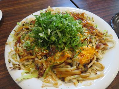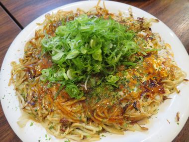 「そば肉玉(チーズ、ネギ追加)」 こちらのお好み焼きのメニューはシンプルでして、お好み焼きとしては「そば肉玉」「うどん肉玉」「スペシャル」「やさい肉玉」の4種類。 これにお好みのトッピングを加えてご注文するようになっています。 トッピングは「チーズ」「ネギ」「餅」「玉子W」「イカ天」「大葉」「麺W」があります。 まず最初にご注文したのは「そば肉玉」にチーズとネギをトッピングしたメニュー。 ご注文から10分以上は経っていたかな。 調理をするのは大将1人みたいなので、提供まで少し時間がかかるみたいです。 ビールを飲んで、コウネやイカ焼きを食している間に登場しました。 いや〜広島のお好み焼き久しぶりですよ。 上部には刻みネギ、その下にクレープ、その下にそばを焼いたもの、その下が野菜や肉を炒めたものになります。 もう一つのトッピングのチーズはお好み焼きの中に入れてくれているみたいで、ヘラで持ち上げるとビヨ〜ンとチーズが伸びておりました。 久々に食しましたが、やっぱりまいう〜だな〜。 でもやっぱり「お好み焼き」っていうより「やきそば」って感じがしちゃいますよね^^; |