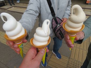 HP映えを考慮して「飯」氏はバニラをご注文してくれました。 ここのソフトクリームもソフトの部分が波波の形ではなく、凹凸がないタイプでした。 前に黒部ダムに行った時もソフトの部分に凹凸がなかったですが、今これ流行っているのかね。