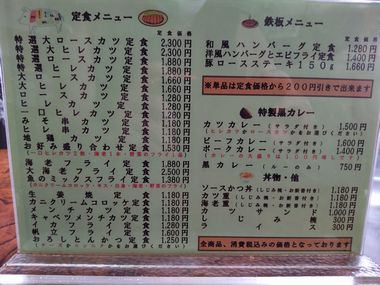 お店は昔ながらの感じですよ。 間口が狭いので、席も少ないのかな!?と思いますが、入ってみると、目の前にカウンター席が4席。 後ろは小上がりになっていまして、4人掛けのテーブルが3〜4台位はあったでしょうか。 カウンター席もテーブル席も割とゆとりがあって、ゆったり座れるところが良いですね〜。 お店の方はお若そうな大将と女性の方が2名いらっしゃいました。 接客もいい感じですし、なかなか良いお店だな〜と思いますよ。 こういう地元に根付いた街の料理屋さんってホントに好きなんですよね〜。 そしてメニューがかなり魅力的! とんかつもロース、ヒレカツ、串カツ等もありますし、ハンバーグ、魚のミックスフライ、クリームコロッケ、カレーなどもう管理人好みのメニューが盛りだくさん! 特にとんかつは、大きさなのか質なのかはよくわかりませんが、 特選大ロースカツ定食、特選ロースカツ定食、大ロースカツ定食、ロースカツ定食と、ロースカツだけでも4種類ありますよ。 「特選」ってのがつくと良い部位なんでしょうかね。 もう少し通って覚えてもらったら聞いてみようと思います。 あと食べログのコメントを見ると、どうたらカレーライスがまいう〜みたいですよ。 こちらのカレーは「黒カレー」というらしいですが、かなり興味深いです。 これだけメニューがあったら飽きずに通い続けられそうですよね〜。 |