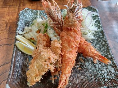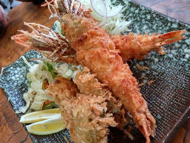 「大海老フライ定食」 今日は久々に初めてのメニューをご注文しました。 こちらはお嫁さんがご注文した「大海老フライ定食(2,500円)」です。 こちらはとんてつさんのメニューの中で一番高いメニュー! 特選大ロースカツでも2,300円ですからね。 このメニューはもしかしたら一生見れないかも。。。と思っていましたが、その日は突然やってきました。 お嫁さんはいつも一番安いランチの生姜焼き定食ばかりご注文していましたが、誕生日の今日はリミッター解除です! しかしこれは何という豪華な見た目でしょうか。 皿は特選ロースや特選ヒレカツの時しか使用しない四角いお皿。 しかもおかずがメチャメチャたくさん乗ってますね! まずは有頭のデカい海老フライが2本。 更にピーマンと玉ねぎのフライが2つづつ、付け合わせはキャベツの千切り、ポテトサラダ、マリネとかなりゴージャスです。 |