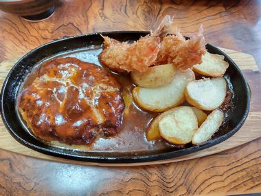 今日は久々に新メニューをご注文〜。 仕事を頑張ったのでご褒美です。 今日は「洋風ハンバーグとエビフライ定食」をご注文です?。 前から気になっていたメニューなんですよ。 ここまでトンカツやヒレカツしか頼んだことがなかったので丸いお皿にトンカツと野菜っていう定番の景色しか見たことがなかったですが、こちらはこの店では珍しく鉄板に乗せてくれています。 このお店では初めて見る光景ですよね。 |