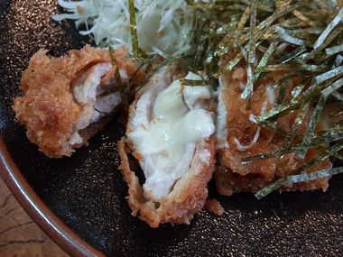 「チーズ入りおろしトンカツ」 こちらはお嫁さんがご注文した「チーズ入りおろしトンカツ」です。 以前一度だけご注文したことがありましたが、かなり久々に見ましたよ。 そしてお嫁さんが「生姜焼き定食」以外のメニューをご注文したのも、ものすごく久々に見ましたよ^^ 今日も一切れいただきましたが、やっぱりチーズ入りのトンカツは美味いね。 このメニューの変わっているところは、味付けされた大根おろしが付いていること。 ソースでも物凄く合うと思うのですが、大根おろしも結構合うんですよ。 大根おろしは薄く醤油で味付けされているので、濃厚なチーズ入りをあっさり頂くことができますね。 いや〜次回は管理人もこれ頼んでみようかな。 |