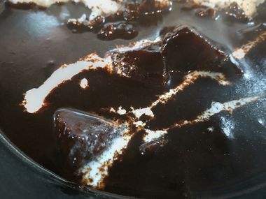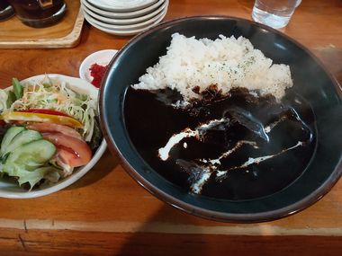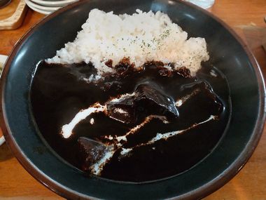 「ポークカレー(カレーのみ)」 こちらのカレーライスの作り方は、冷蔵庫にすでに調理済のカレールーが保存されておりまして、それを1人分鍋に入れて煮込みます。 このルーには特に固形物は入っておらず、適度な粘度のルーのみです。 カツカレーの場合は、丼にご飯を盛って、その上からこのカレールーを回しかけ、最上部にカツを鎮座させます。 今回のポークカレーの作り方をガン見してましたが、カレールーを温めるところはカツカレーと同じですが、冷蔵庫からラップに包まれた丸い物体を取り出しました。 この中には豚の三枚肉を一辺4cm程のブロック状にした肉塊が4つくらい入っていましたよ。 こちらの肉を温めて、それをカレールーに混ぜて最終的にカレールー+肉塊をご飯の上に回しかけておりました。 ここのカレーは真っ黒なので写真で撮ってもどれが肉なのか分からないね。 |