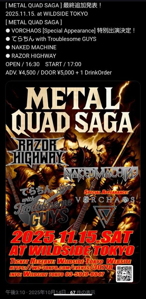 今日のコンサートですが、「METAL QUAD SAGA」と銘打ったコンサートです。 出演するのは「RAZOR HIGHWAY」だけではありませんで、KANちゃんさんが所属する「NAKED MACHINE」「寺ちん with Troublesome GUYS」」「VORCHAOS」の4バンドが出演します。