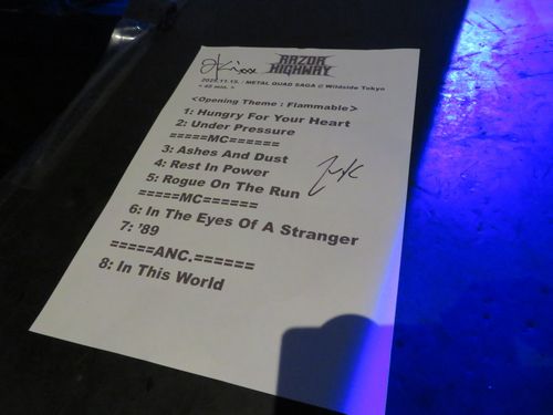 【RAZOR HIGHWAY アンコール1曲込み全8曲55分】 SE.FLAMMABLE SOULS 1.HUNGRY FOR YOUR HEART 2.UNDER PRESSURE 3.ASHES AND DUST 4.REST IN POWER 5.ROGUE ON THE RUN 6.IN THE ARMS OF A STRANGER 7.'89 《アンコール》 8.IN THIS WORLD |