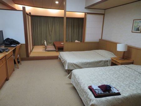 今日の部屋も前回ご来店したときと同じ「和洋室」というタイプの部屋です。 ドアを入ってすぐ右側にベッドが2つ並んでおり、奥は子上がりになっていて和室6畳があります。 ベッドが置いてある部屋もかなり広くてベッドを置いても全然余裕で歩き回れます。 1人のときは安いビジネスホテルにしか泊まらない管理人はベッドを置いたら通路は人1人通れるのがやっとって感じの部屋に慣れているので、逆になんだか落ち着かないね^^; せっかく和洋室で和室も付いていたのですが、部屋に到着したらベッドに横たわり、和室はほとんど使いませんでした。 |