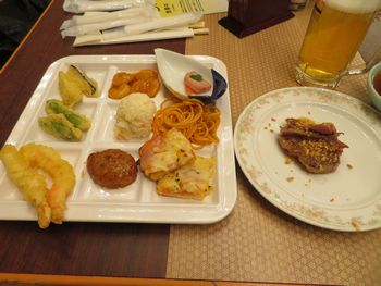 こちらが管理人の最初の料理達です。 ここの料理の売りは何といってもシェフが目の前で調理した料理達でしょう。 その代表格がステーキ、天ぷら、貝焼きになります。 最初は貝焼きが混んでいたので、まずはステーキと天ぷらを頂きました。