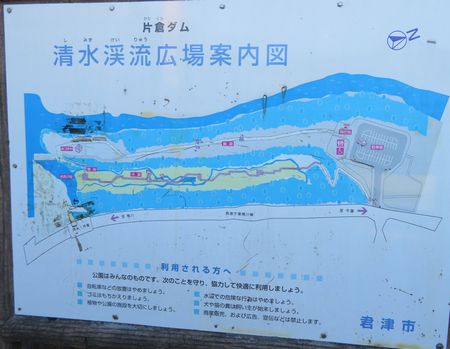 駐車場から清水渓流広場の入口付近には清水渓流広場の案内図がありました。 これによりますと、スタート地点から川沿いにまっすぐ舗装路が伸びていまして、最終地点に行くとそこに洞窟があります。