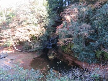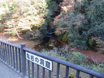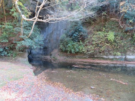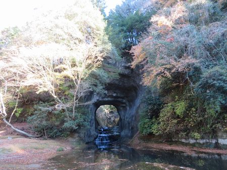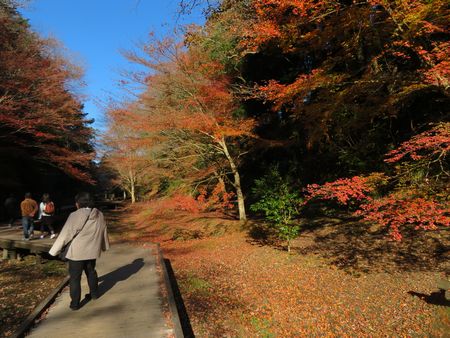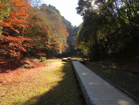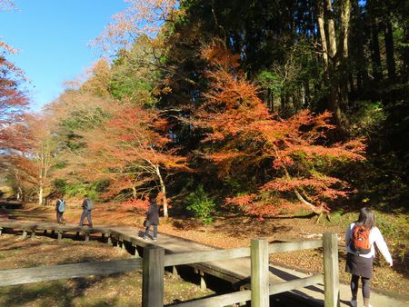 「亀岩の洞窟」から先ほどの駐車場までは、ご覧のような木道が続いています。 木道の脇には小川が流れており、木道の両脇には木々が生い茂っています。 残念ながらすでにほとんど葉が落葉している木もありましたが、場所によってはまだモミジが綺麗に紅葉している木もありました。