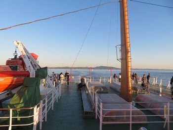 日が傾きはじめているので、少し黄昏時って感じの雰囲気ですね〜。 行きには甲板にはほとんど人はいなかったですが、帰りは甲板も大盛況。 特に甲板の最後尾は喫煙所にもなっているので、タバコ吸っている人が多かったです。