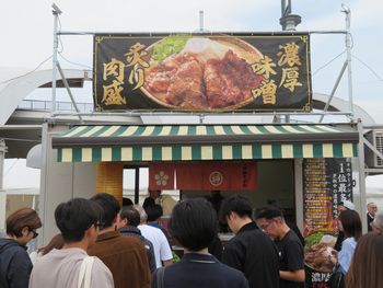 | 今回も2杯は頂きますので、最初の一杯目は、味がそんなにきつくないラーメンを選びたいところです。 1店舗目から濃い味のラーメンを食してしまうと、2杯目のラーメンの味が分からなくなってしまいますからね。 今回第3幕で出店しているお店を見渡しますと、なにやら「濃厚」の文字が多い・・・ あっさり醤油の店は見る限り2店舗くらいしかありませんでした。 そんな中、最初の1杯に選んだのは、「津軽煮干王道系「3種盛」 中華そば ひらこ屋」さんのラーメンです。 味のほうは後ほどご紹介しますが、こちらの「中華そば ひらこ屋」さんは、11:15時点で全店舗の中で一番行列が長いお店でした。 というより「中華そば ひらこ屋」さんの一人勝ちって感じでしたね。 他の店舗は行列というより、お客さんが4〜5人並んでいるだけなのですが、 ひらこ屋さんは、かなり長い行列ができていましたもんね。 最初は行列に並ぶか非常に悩みましたが、食いたいものに行ったほうが良い!ということで、行列に並び始めました。 元来管理人は行列に並ぶことはしないのですが、先般、国分寺連合の北陸3県旅行で「麺屋 大河」さんに40分並んだ実績もありますので、今回もチャレンジすることにしました。 まぁ3人でしゃべりながらなら、あっという間ですけどね^^ |