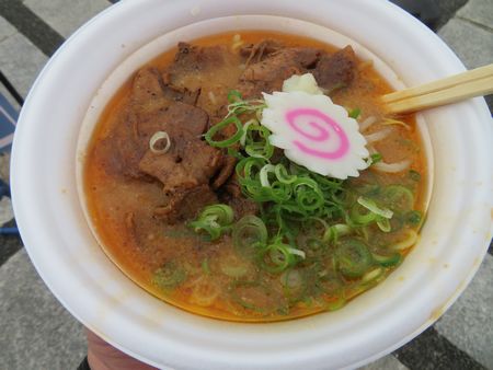 | 最初の1杯はものの5分で完食! それでは続いて2軒目に参りましょう! 次はもう「濃厚」ラーメンを食しても大丈夫ですね! 2軒目は「飯」氏にチョイスして頂きました。 2軒目に選んだのは、「加賀味噌麺友会」の味噌ラーメン! こちらはお店ではなく、石川県は加賀の有志の方のお店なんでしょうかね。 ラーメンフェスタのホームページを見ますと、次のように記載されていました。 「本年度よりご当地ラーメン認定!! 加賀藩主「前田利家公」時代より受け継がれる"加賀味噌"の中でも贅沢な「十二割麹味噌」を使用。 長期熟成・天然醸造の味噌に、さらなる進化を求め、厳選しだ"秘伝のだし”をブレンド。 上品な香り・強烈なコク・濃厚な味わいのスープに”馬鈴薯”入の国産小麦の熟成麺がよく絡む。 炎を上げて炙る国産豚バラ肉は旨味を最大限に引き出し、黒糖を隠し味に香ばしく仕上げた“熱撰たまり醤油"タレが食欲をかき立て箸を進めずにはいられない!」だそうです。 今回初めて「ご当地ラーメン」に認定されたのですね。 今までもラーメンフェスタで似たようなラーメンを食していると思っていましたが、前の記録などを見ると、異なるお店みたいですよ。 以前食したのは札幌味噌ラーメンでしたもんね。 |