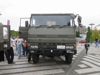 | イベント会場の奥のほうには、陸上自衛隊の車輛も展示されておりました。 入隊希望者を増やすための広報の一環なのかもしれませんね。 最近自衛隊への入隊希望者が減少していると聞きますからね。 防衛費を増額しても、現場の人が減っていっては元も子もないですが、それがゆえに自動化などが進み、最小限の人員で運用できる装備品も多くなっています。 駆逐艦やフリゲート艦でも最新鋭の艦船では自動化が進み、乗員の数が大分減ってますからね。 でも自衛隊の展示は子供たちにも大人気で車輛に実際に乗り込んだりすることもでき、隊員の方が一緒に撮影してくれたり、子供用の自衛隊服を着せてくれたりしていました。 がんばれ自衛隊! |