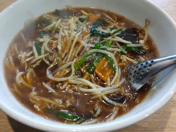味噌、まぜそば等 <2024.07.27> 本日は久々に本厚木にコンサートを見にやって参りましたよ。 以前からよくご来店しておりました「CABIN」というライブハウスを経営されていたお母さんが亡くなられたことで、しばらく営業をしていなかったのですが、 経緯は不明ですが、再度営業を開始してくれました。 今日もTRIXのメンバー(元)の平井武さんと須藤満さんのタケストのコンサートがあるということで、久々のご来店に胸躍らせております。 しかも今日は12年ぶりに会う「ACE」氏も一緒です。 今日は「飯」氏、「ACE」氏、管理人の3人でご来店しました。 今日は管理人が4〜5軒のラーメンをピックアップして、3人で決めたのですが、不思議と全員一致でこちらのお店に決定しました^^ コンサートの開始は18:00〜ということでしたので、17:00に本厚木に集合〜。 ここから3人でお店に向かいます。 お店はCABINがある出口とは逆の出口(南口)から出て、徒歩3分のところ。 こちらの出口は南口よりはお店が少なく、ちょっとだけ寂しい感じですね。 お店はとても綺麗で、結構新しいのでしょうか。 お店だけでなく、本厚木駅の周辺は、道や施設もとてお店も綺麗でとても綺麗な雰囲気なんですよね。 お店の外観も非常に綺麗で、木造りとコンクリートが融合したようなオシャレな外観をしておりました。 店内はカウンター席だけかと思いきや、一番奥には4人掛けのテーブル席もあります。 入口を入り、右側に券売機があり、ここでチケットを購入して席につきます。 今日は3人だったのでテーブル席を案内してくれました。 テーブル席は、カウンター席と壁で仕切られているので、周りが気にならなくてよかったですね。 こちらのお店のメニューですが、うたい文句が「博多豚骨の味噌ラーメン」とのこと。 博多豚骨の味噌って珍しいですよね。 メニューを見てみますと、ほとんどのメニューが味噌ラーメン。 他に焦がし醤油のラーメンやまぜそばもあるようですが、メニューの数は圧倒的に味噌ラーメンが多かったです。 お店の前にラーメンの写真が掲載された立看板があるのですが、どれもすごくトッピングのボリュームが満点! ただ写真だと実際の丼の大きさなどが分からないので、今回は「ACE」氏と管理人は「晴っぴスペシャル」といういわゆる特製ラーメンをご注文。 そして「飯」氏は「炙り角煮チャーシュー味噌ラーメン」をご注文しました。 あと一人一本瓶ビールもご注文しておきました。 こちらのお店はライスが無料とのことで、ご注文時に「ライス無料ですがどうですか?」と聞いてくれましたが、3人とも丁重にお断りしておきました。 結果的にラーメンのボリュームがすごかったので、ご飯食べなくてよかったです^^; まずはビールが運ばれてきましたので、3人で久々の再会を祝って乾杯です〜。 そろそろビールがなくなりそうなところでタイミング良くラーメンが到着しました。 まずは「飯」氏の「炙り角煮チャーシュー味噌ラーメン」が、次いで「ACE」氏と管理人の「晴っぴスペシャル」が到着です。 「飯」氏の「炙り角煮チャーシュー味噌ラーメン」は肉が多くて非常に魅力的! 管理人も肉好きなので、「炙り角煮チャーシュー味噌ラーメン」や「重ねチャーシュー味噌ラーメンなど」も候補に入れていたのですが、今回はバランスの取れた「晴っぴスペシャル」にしておきました。 さてまずはスープを一口いってみましょう! ・・・おお〜味噌スープ、まいう〜! これは管理人好みの味噌スープですよ。 味噌の複雑度は中程度ですが、味噌の味が濃いめで「あ〜味噌食ってるな〜」という感じ。 「博多豚骨の味噌」というふれ込みだったので、豚骨ダシが前面に来ているかと思いきや、バランスが取れていて、あまり豚骨を強く感じることはありません。 味噌味がしっかりしているので、白髪ねぎとかコーンなどをスープに浸して頂くと非常にまいう〜になりました。 このスープに合わせる麺ですが、太麺の縮れ麺。 コシがあって味噌味に負けない麺になっています。 ただスープを一口頂いた後に麺をすぐに食したかったのですが、あまりにトッピングが多すぎて、下からほじくりださないと麺を食べれない^^; 麺を下からほじくり出す過程で、途中にあった茹でモヤシなども麺と一緒についてくるので、麺とモヤシの食感がとても良い感じ。 今回はトッピングが多すぎて麺がどのくらいの量が入っていたのか、体感的に分らなかったのですが、一杯全部食したあとは3人共腹パンパンでした。 結構腹を空かせて行ったのにね^^; あと「飯」氏の炙り角煮もすごくまいう〜だったそうですよ。 炙り角煮だけでなく、チャーシューも入っていて、こちらもすんごいボリュームでした。 でも味噌スープが美味すぎて、結局今日も全部飲み干してしまいました^^; これは味噌ラーメン好きの管理人も納得の一杯でした。 神奈川県厚木市旭町1-24-15 Tel.046-280-6869 |